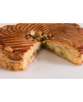 13,00 €La galette des rois artisanale à la crème d'amande & pistache, fruits secs torréfiés. Réalisée par nos pâtissiers.