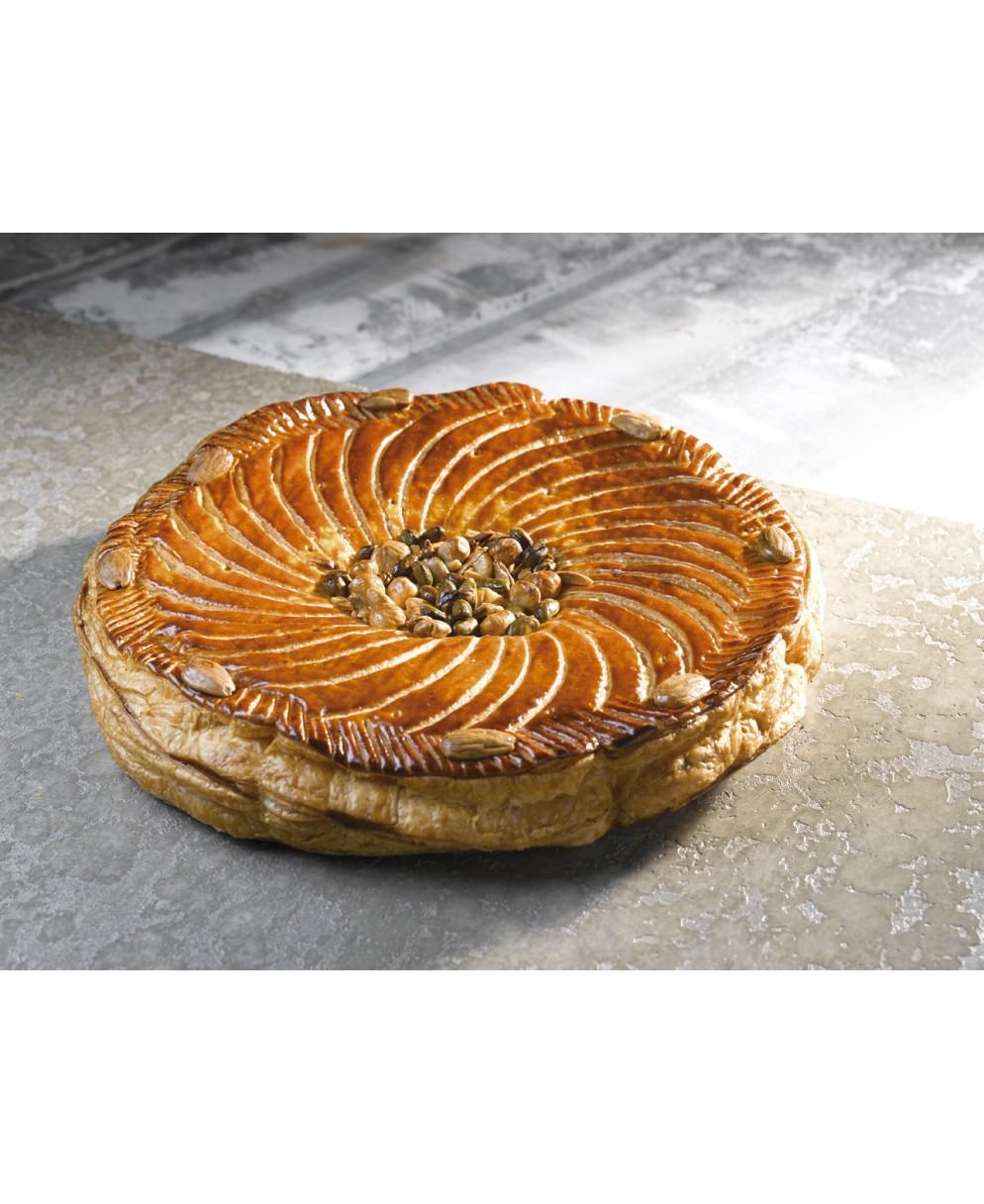 La galette des rois artisanale à la crème d'amande & pistache, fruits secs torréfiés. Réalisée par nos pâtissiers.