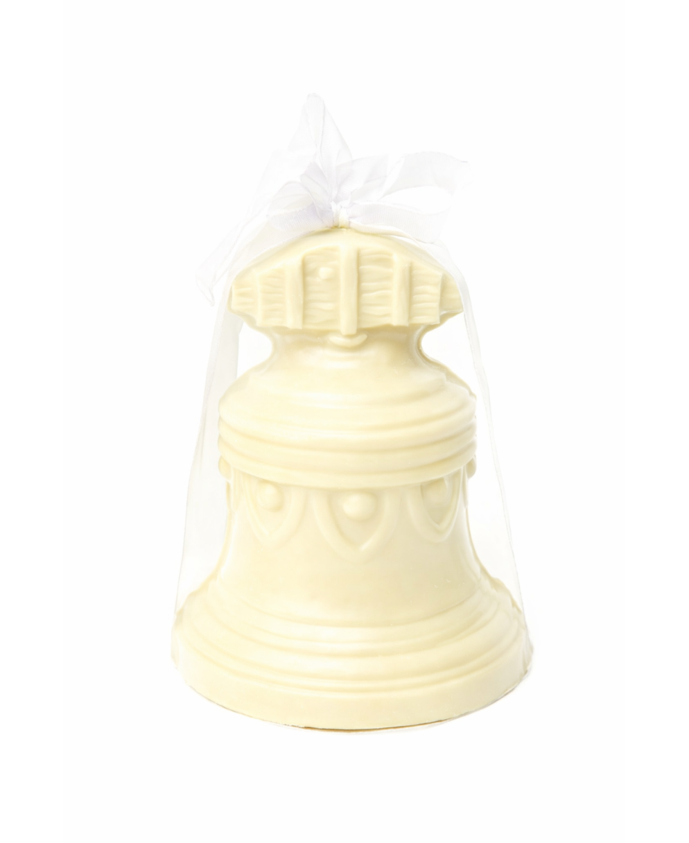 Pour Pâques, une cloche en chocolat blanc garni de fritures chocolat.