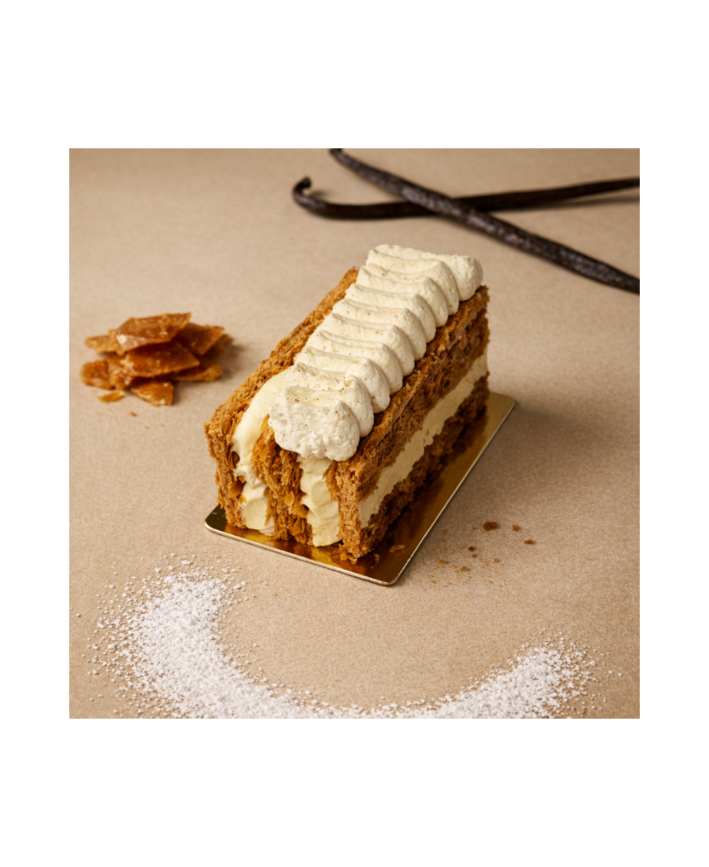 Millefeuille et mille merveilles ! Le feuilletage est travaillé manuellement par nos patissier.es pour créer une pâtisserie unique d'exception garnie d'une crème fouettée et d'une crème pâtisserie à la vanille !