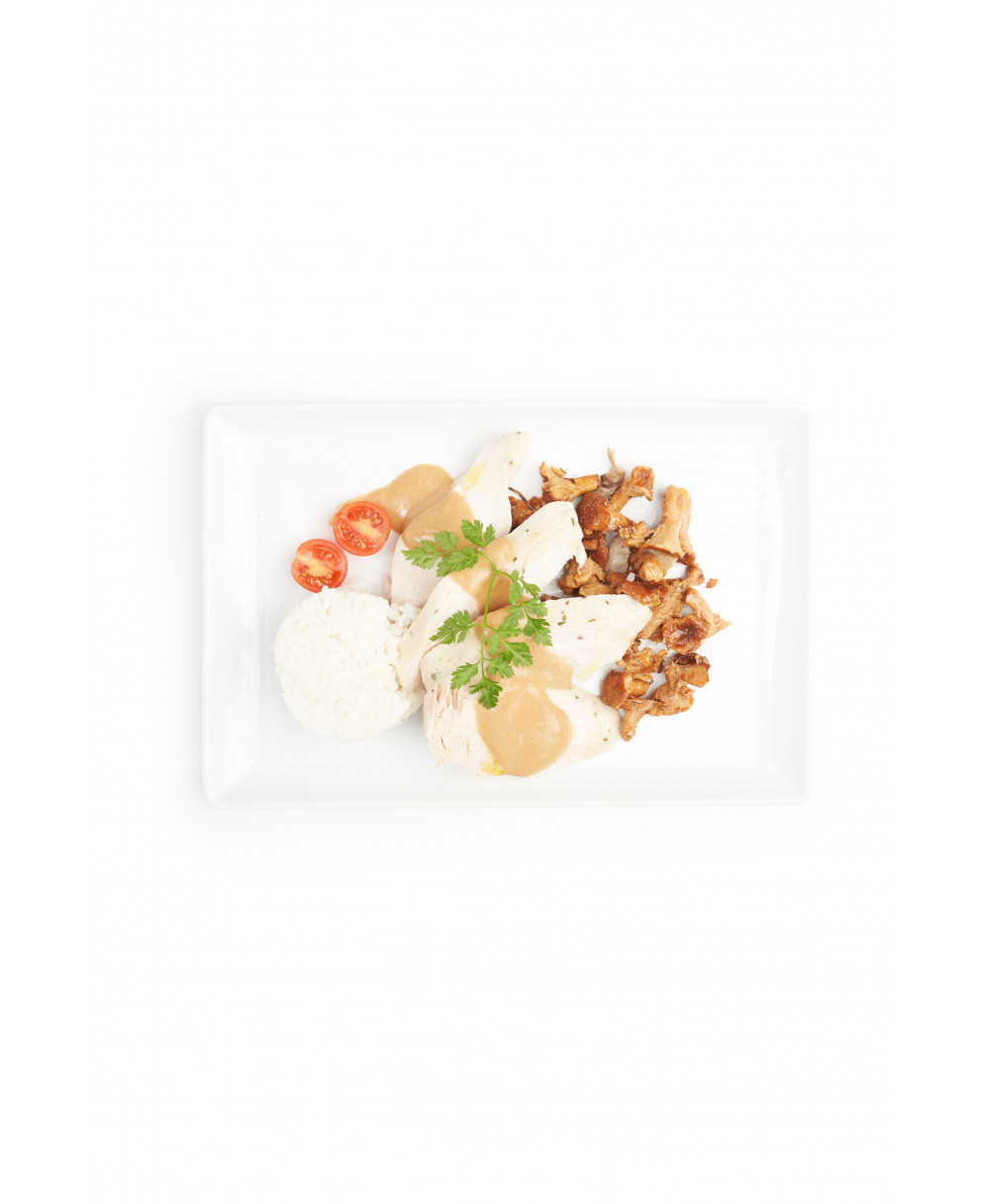 Environ 250 à 300g. Suprême de volaille aux deux cuissons, sauce crémeuse.