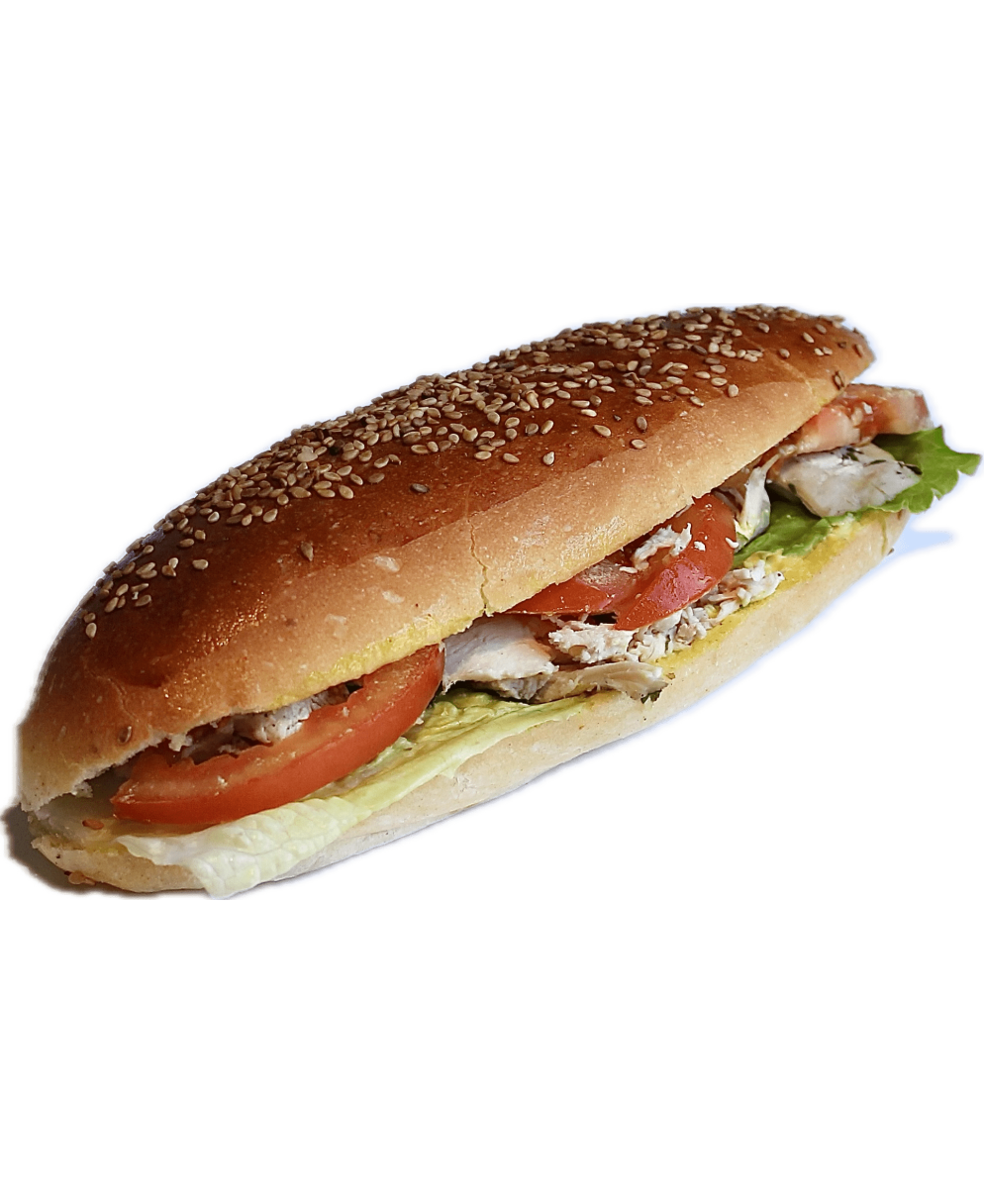 Pain moelleux au sésame, poulet, tomate, salade romaine, mayonnaise au curry