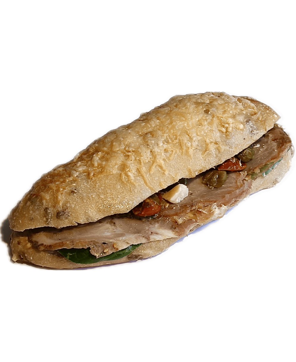 Pain parmesan et olives vertes, tranches fines de rôti de veau, câpres fines, pousse d'épinard, sauce Vitello.
